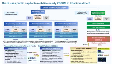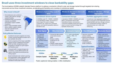Brazil: $250M is deployed to address solar and storage constraints. It utilizes three investment windows focusing on hybrid utility-scale photovoltaics and BESS, standalone grid-scale BESS, and C&I solar aggregation. It provides junior subordinated tranches, first-loss warehouse facilities, and FX hedges to unlock senior lending.