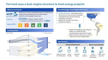 The hypothetical Americas Cross-Derisking Fund is a regional investment vehicle in the United States, Brazil, and Chile designed to bridge the gap in LATAM. The fund focuses on energy infrastructure and nature-based solutions to foster sustainable growth and energy transitions.