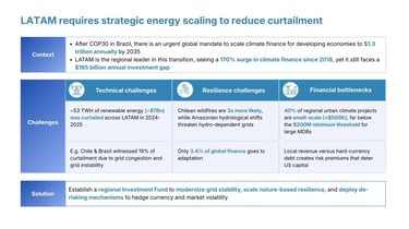 Despite a 170% surge in climate finance in LATAM since 2018, the region faces a $165 billion annual investment gap due to curtailment, grid congestion, wildfires impacting grids, and many projects being small-scale to fall beneath the threshold for larger development bank funding ($200M).