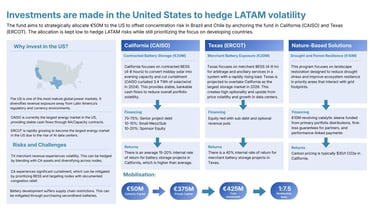 United States: $50M is deployed to focus on battery energy storage systems in California and Texas, as well as reforestation to prevent wildfires. In California (CAISO energy market), the focus is on contracted BESS to convert midday solar into evening capacity, targeting an IRR of 15-20%. In Texas (ERCOT), the focus is on merchant BESS for arbitrage and ancillary services, targeting a projected 40% IRR.