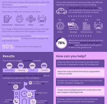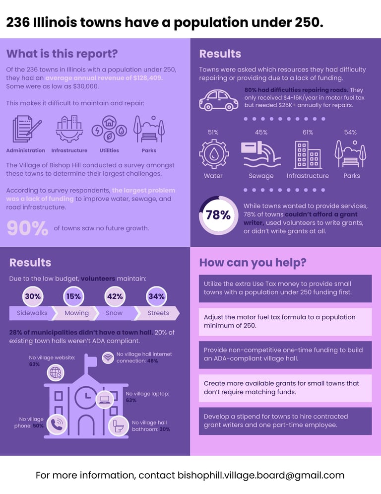There are 243 small towns in the state of Illinois with a population under 250. Annual municipal budgets are allotted by the State of Illinois based on population count. This means that smaller towns may only receive an annual budget of $20-100K. This prevents necessary infrastructure repairs, such as constructing roads, sidewalks, or fixing water production.